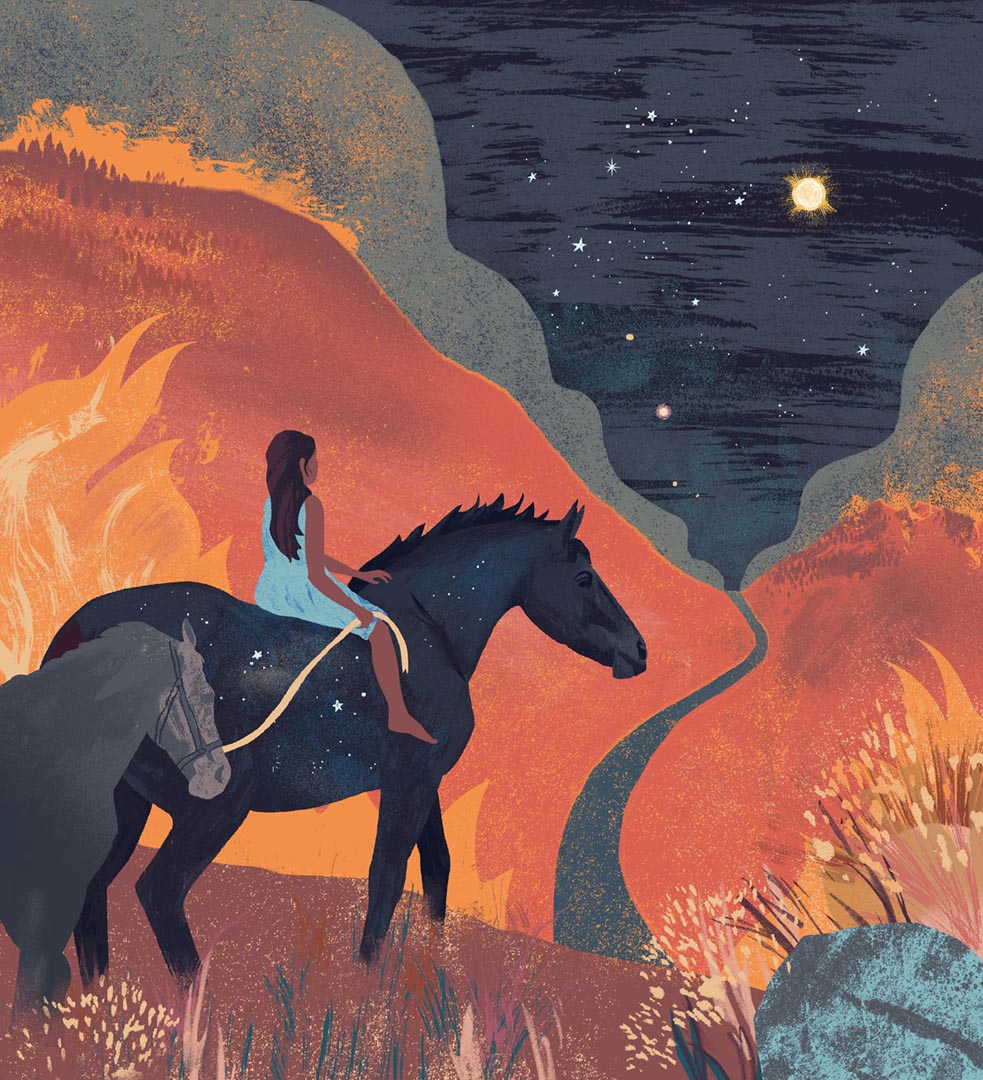 During the wildfire season, everyone was forced to evacuate in extreme conditions. This illustration is about the calm these brave individuals found to help animals escape surrounded by intense panic.